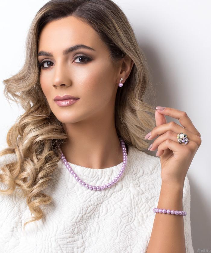 Inel flori mov și turcoaz cu o perlă de sticlă albă