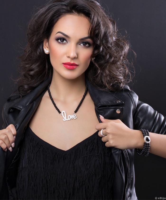 Colier 'Love & Crystals', dintr-un şir de perle de sticlă negre, cu element metalic în formă de text “Love”, încrustat cu cristale albe.