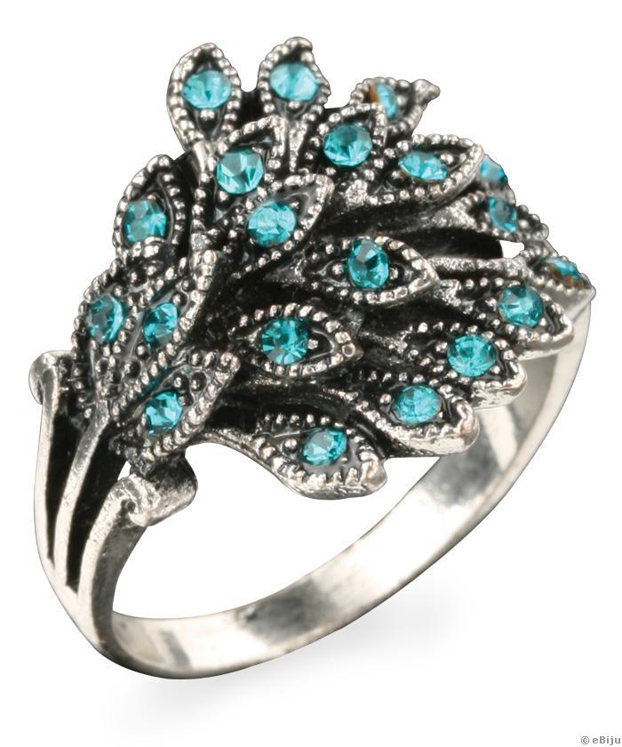 Inel model frunze cu cristale turcoaz, din metal argintiu antichizat. Latime model: 1.8 cm.