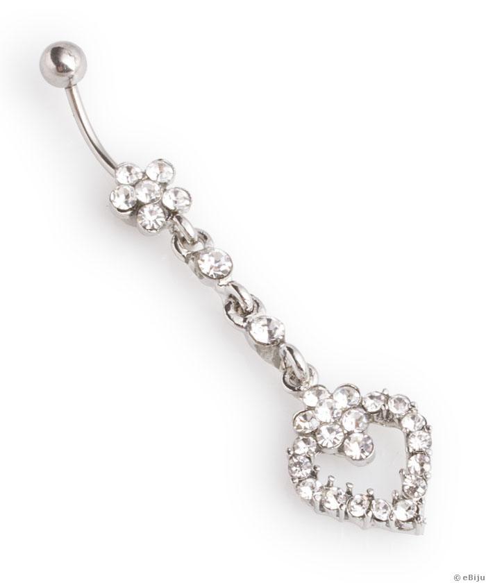 Piercing de buric în formă de inimioară şi floricică, încrustate cu cristale albe, cu acul dinoţel chirurgical.